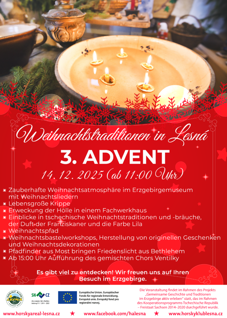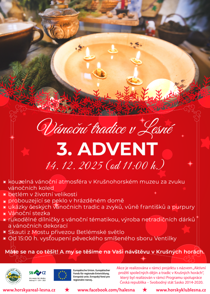 V neděli pokračujeme 3. adventem u nás v Horském areálu Lesná. Startujeme v 11:00 h., rukodělné aktivity, vánoční atmosféra, adventni koncert pěveckého sboru Ventilky a skauti z Mostu dovezou na 13:00 h. Betlémské světlo! Těšíme se na Vás!